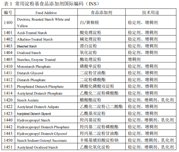 被廣泛應(yīng)用在食品領(lǐng)域的變性淀粉類型主要有酯化、醚化、氧化、交聯(lián)等, 以及上述類型的復(fù)合變性,表 1 列出了常用淀粉基食品添加劑國(guó)際編碼[4]。木薯 淀粉具有許多優(yōu)良特性適合加工變性淀粉,目前我國(guó)木薯變性淀粉產(chǎn)量已占變性 淀粉總產(chǎn)量 40%[5],本文針對(duì)木薯變性淀粉在幾個(gè)重要食品領(lǐng)域中的應(yīng)用作一些簡(jiǎn)單闡述。