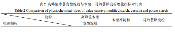 3.2.1 高峰值木薯變性淀粉與木薯、馬鈴薯原淀粉理化指標(biāo)對(duì)比