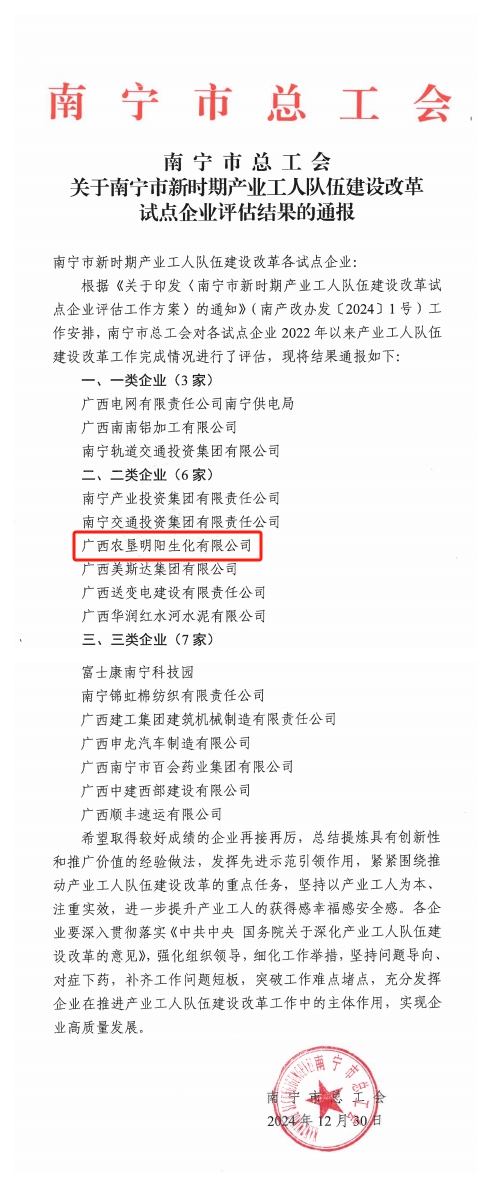 2024年12月30日,明陽生化公司被南寧市總工會認(rèn)定為南寧市新時期產(chǎn)業(yè)工人隊伍建設(shè)改革試點二類企業(yè),并獲得專項補助經(jīng)費6萬元,助力推進產(chǎn)業(yè)工人隊伍建設(shè)改革工作。