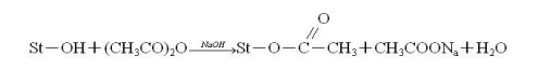 醋酸乙烯分子量 86.09,醋酸酐分子量 102.09,兩種試劑都具有一個(gè)酸酐反應(yīng)基 團(tuán),因此在相同試劑添加量下,使用醋酸乙烯比醋酸酐得到的產(chǎn)品具有更高的理論取 代度。一般醋酸乙烯反應(yīng)是以 NaCO3 為催化劑,本文以燒堿為催化劑進(jìn)行反應(yīng),驗(yàn) 證同等條件下醋酸酐和醋酸乙烯反應(yīng)的區(qū)別。醋酸乙烯的酸酐鍵在堿性作用下被活 化,主要與淀粉的仲醇碳原子發(fā)生取代反應(yīng),如下反應(yīng)式: