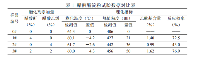 ②以相同催化劑 NaOH 和 4%酯化劑添加量制備的醋酸酐(1#)和醋酸乙烯(2#)酯化 淀粉,1#比 2#具有更高的反應(yīng)效率和更低的糊化溫度,但峰值粘度略低;