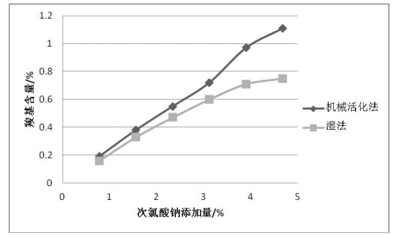 改變次氯酸鈉添加量,分別采用機(jī)械活化法和濕法制備氧化淀粉,探討產(chǎn)物羧基含量的 影響,次氯酸鈉含氯量為 13.8%,淀粉含水量為 12%。機(jī)械活化法反應(yīng)條件為溫度 65℃、 時(shí)間 60min、機(jī)械轉(zhuǎn)速 280r/min、次氯酸鈉分 2~3 次加入;濕法反應(yīng)條件為溫度 30℃、時(shí) 間 6h、攪拌轉(zhuǎn)速 500r/min、次氯酸鈉分 2~4 次加入。次氯酸鈉添加量對(duì)淀粉羧基含量的影響如圖 3 所示。