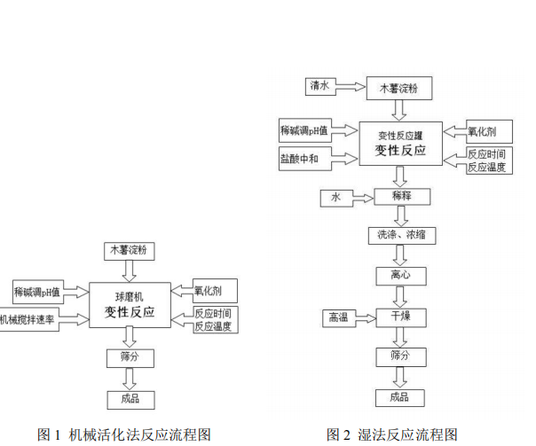 本課題,對(duì)比了水溶液濕法(簡(jiǎn)稱濕法)和機(jī)械活化固相法(簡(jiǎn)稱機(jī)械活化法)兩種不 同反應(yīng)條件下,氧化淀粉工藝技術(shù)及性質(zhì)的區(qū)別。