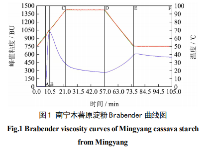 1.2.3 Brabender粘度的檢測方法 打開粘度計(jì)操作程序,設(shè)置轉(zhuǎn)速為 75 r/min,升 降溫速度為 2.0 ℃/min,測試范圍700 cmg,起始測試 溫度為45 ℃,升溫至92 ℃后保溫15 min,降溫至50 ℃ 后再保溫10 min,點(diǎn)擊“開始測試”選項(xiàng)至自動(dòng)歸零;抬 高粘度計(jì)上部分(即測量探針),按含固率為6%,總體 積為450 mL配制溶液,將配制好的待測溶液轉(zhuǎn)移至樣 品缽,壓下粘度計(jì)上部分,直至與樣品缽卡住密合, 樣品缽開始自動(dòng)旋轉(zhuǎn),測試開始;當(dāng)溫度升至45 ℃時(shí) 按設(shè)置要求開始由電腦程序自動(dòng)測粘度曲線;測試結(jié) 束后,保存測試結(jié)果,讀取峰值粘度和糊化溫度數(shù)據(jù)。