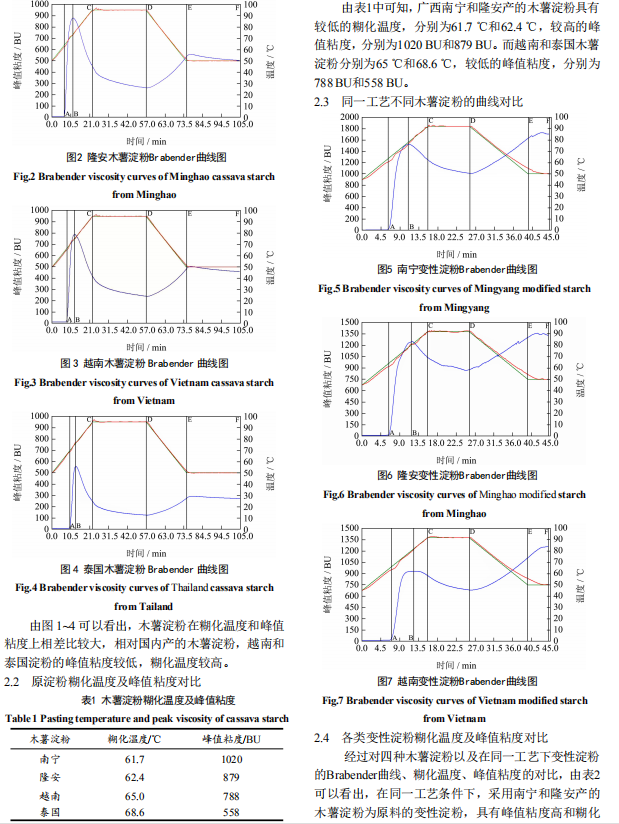 木薯原料性能的好壞是影響其變性淀粉的重要 因素,為了獲得更低糊化溫度和較的高峰值粘度的木 薯變性淀粉,在生產(chǎn)上,首先要對(duì)木薯淀粉原料的糊 化溫度、峰值粘度及熱粘度等指標(biāo)進(jìn)行分析,從而選 擇品質(zhì)較好的木薯原淀粉作為生產(chǎn)的原料。因此采用 Brabender 和 NDJ-79 型粘度儀對(duì)四種木薯淀粉的糊化 溫度和粘度進(jìn)行研究,從而選擇具有低糊化溫度、高 峰值粘度及高熱粘度的木薯淀粉作為生產(chǎn)原料,生產(chǎn) 出具有優(yōu)良性能的乙?;宦?lián)變性淀粉,以下為四種 木薯淀粉的 Brabender 粘度曲線對(duì)比圖及分析。