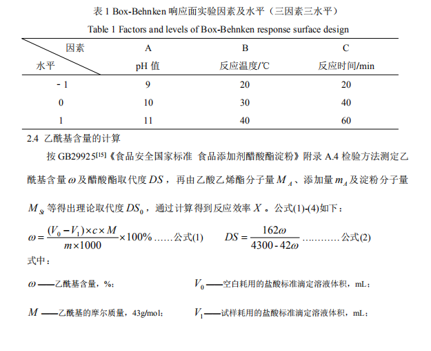 【概要描述】使用乙酸乙烯酯為乙?;噭?,考察三聚磷酸鈉(STPP)對醋酸酯淀粉性能的影響,并通過響應面設(shè)計優(yōu)化實驗方案。結(jié)果表明,添加3%STPP制備的醋酸酯淀粉,反應效率同比增加25.95%;采用三因素三水平的Box-Behnken響應面試驗設(shè)計方法,考察反應pH值、反應溫度、反應時間對醋酸酯淀粉反應效率的影響,結(jié)果顯示所得回歸模型顯著。