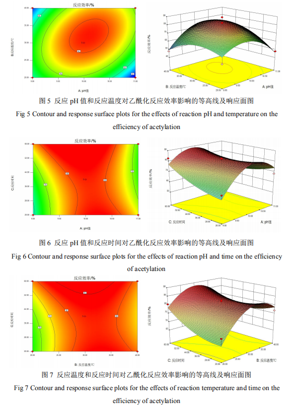由表 3 可知,方程一次項中 B 為顯著因素,A、 C 為不顯著因素;AB 和 AC 交互作 用顯著,BC 交互作用不顯著;方程二次項中 A2為極顯著因素,B2為顯著因素,C2為不顯 著因素,表明各影響因素對響應值不是簡單的線性關(guān)系,二次項、交互項與響應值有很大關(guān) 系。影響以乙酸乙烯酯為酯化劑的醋酸酯淀粉反應效率的各因素按影響力度大小排序依次為 B(反應溫度)、A(pH 值)、C(反應時間) 。
