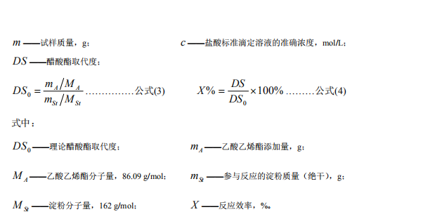 用燒杯稱取 300g 木薯淀粉(絕干)加水調(diào)漿至濃度 35~40%,用 6%氫氧化鈉溶液調(diào)淀 粉漿液 pH 值 10 并攪拌 10 分鐘,控制反應溫度 30~35℃,加入 VAC 攪拌反應 40 分鐘,其 間反應至 2 分鐘時調(diào)一次 pH 值 10,然后用鹽酸調(diào)節(jié)漿液至 pH 值 6~6.2 終止反應,再經(jīng)洗 滌、抽濾、烘干、粉碎、過篩,得醋酸酯淀粉 VAC-SA。