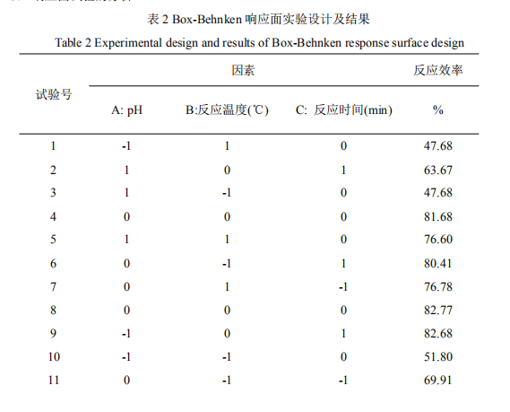(2)響應面實驗所得最佳工藝條件為:反應 pH 值 9.83、反應溫度 29.3℃、反應時間60min,得到反應效率理論值為 88.54%。在所得條件下進行三次平行試驗驗證,得到醋酸酯 反應效率的實際值為 87.39%。表明基于響應面法優(yōu)化所得的實驗結(jié)果與模型符合良好,該 模型能較好地模擬并預測醋酸酯反應效率。