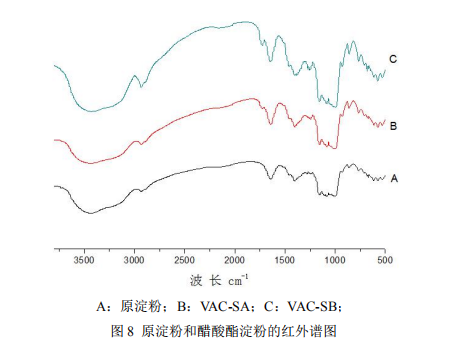 對原淀粉和醋酸酯淀粉 VAC-SA、VAC-SB 進行紅外譜圖的分析,結(jié)果如圖 8 所示。