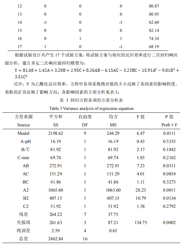運用 Design-expert 軟件對模型進行最優(yōu)化求解,預測出最佳制備條件:反應 pH 值 9.83、反應溫度 29.3℃、反應時間 60min,得到反應效率理論值為 88.54%。為檢驗該方法的 可靠性,在所得條件下驗證試驗。取三次平行試驗結(jié)果計算平均值,得到醋酸酯反應效率的 實際值為 87.39%。可見,基于響應面法優(yōu)化所得的實驗結(jié)果與模型符合良好,該模型能較 好地模擬并預測醋酸酯反應效率。