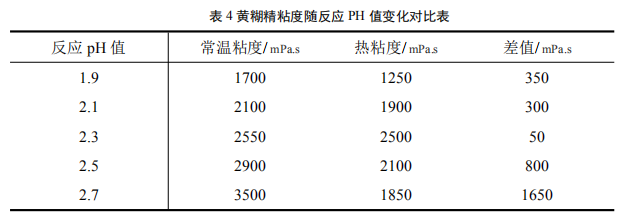 反應(yīng)條件:反應(yīng)體系的含水量 4%、反應(yīng)時間 140min、反應(yīng)溫度 150℃,考察反應(yīng) pH 值對糊精粘度的影響如表 4 所示。