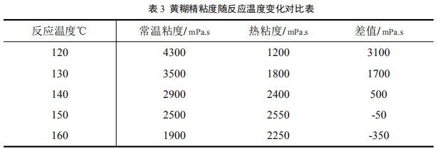 反應(yīng)條件:反應(yīng)體系的含水量 4%、反應(yīng)時間 140min、反應(yīng) pH 值 2.3,考察反應(yīng)溫度 對糊精粘度的影響如表 3 所示。