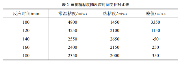 反應(yīng)條件:反應(yīng)體系的含水量 4%、反應(yīng)溫度 150℃、反應(yīng) pH 值 2.3,考察反應(yīng)時間對 糊精粘度的影響如表 2 所示。